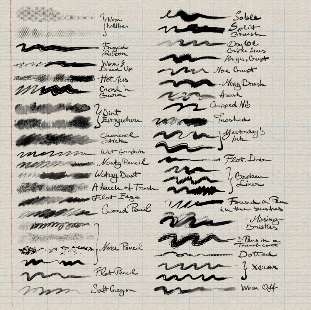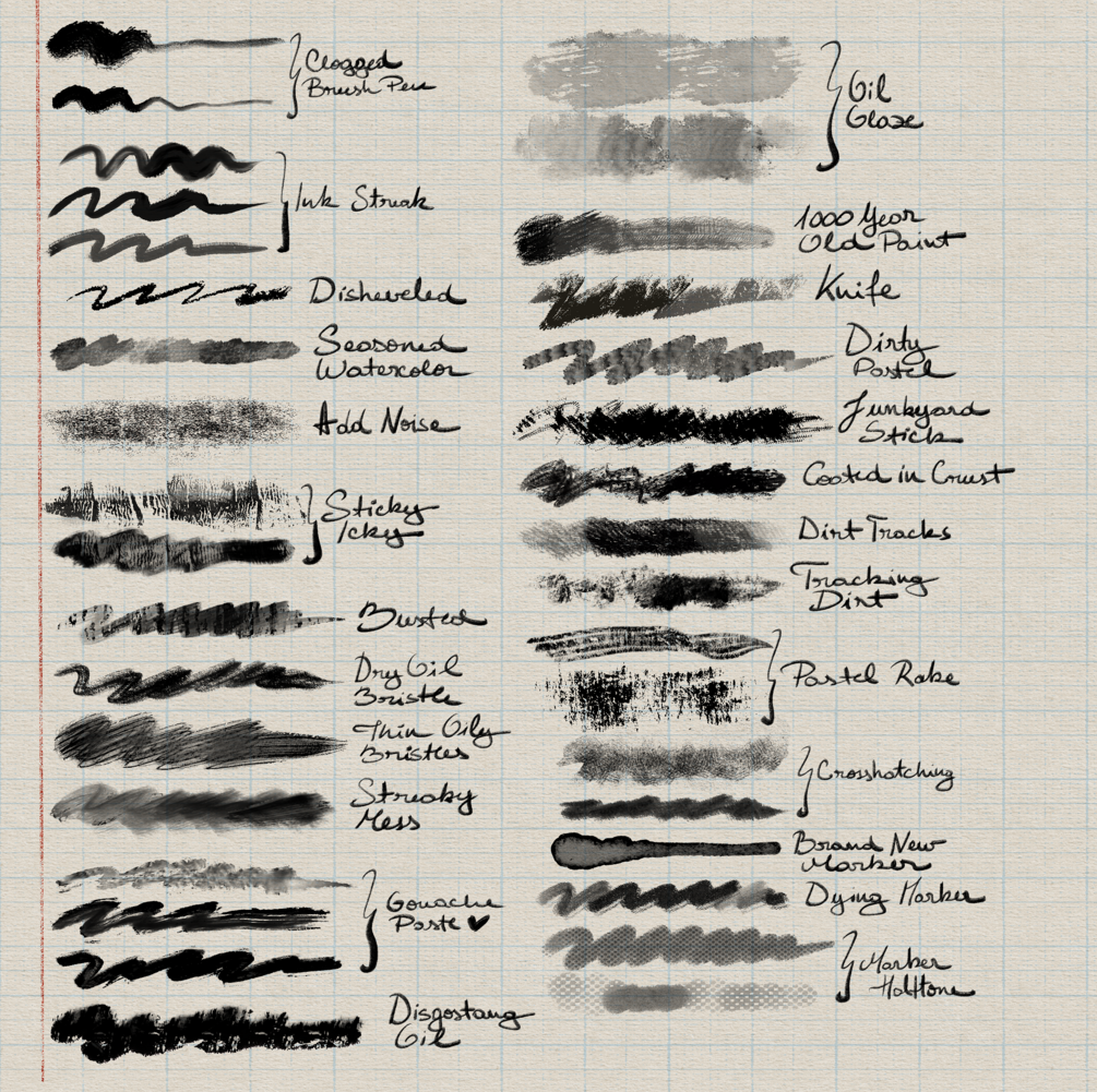 A Procreate brush pack containing around 100 brushes imitating traditional media